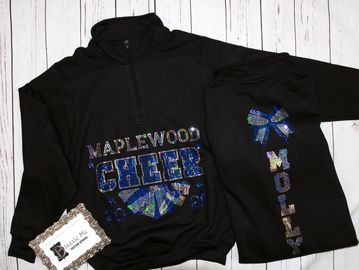 Maplewood Rockets cheer jacket, shown with black glitter & silver glitter.
