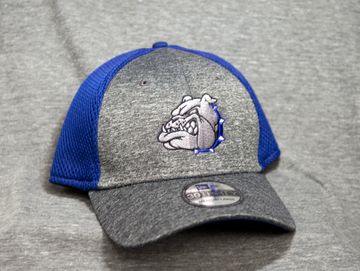 Embroidered bulldog cap. Shown on a New Era shadow mesh back cap.